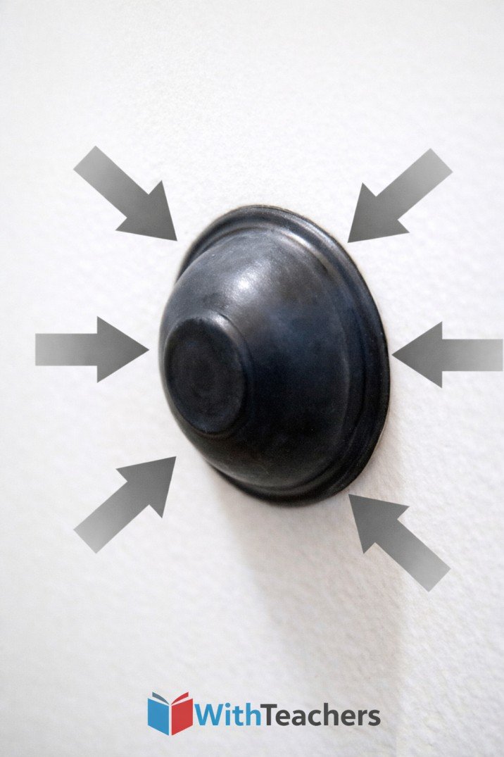 A rubber sucker stuck tightly to a smooth wall demonstrating atmospheric pressure pushing it from the outside]