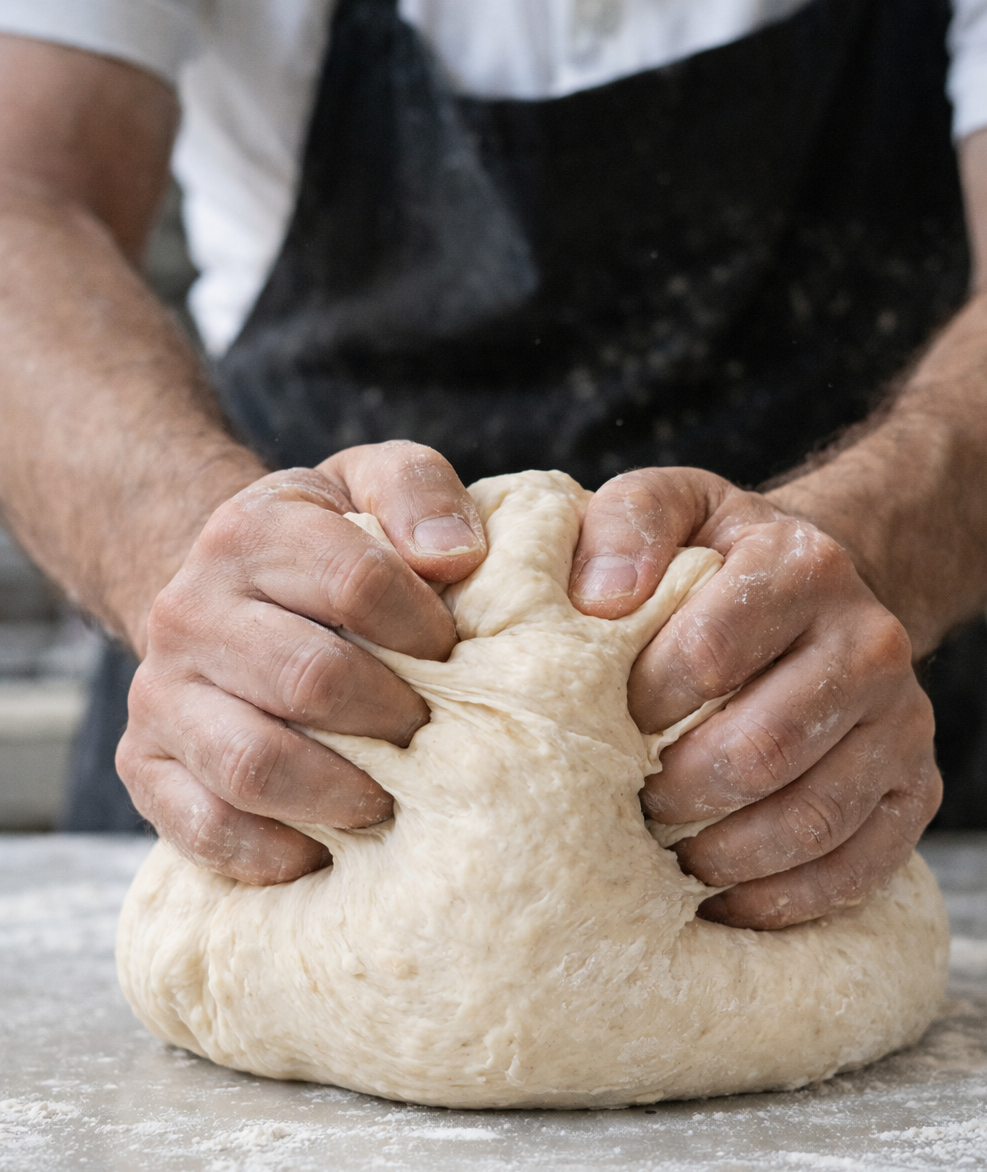 A baker kneading dough changing its shape using muscular force]