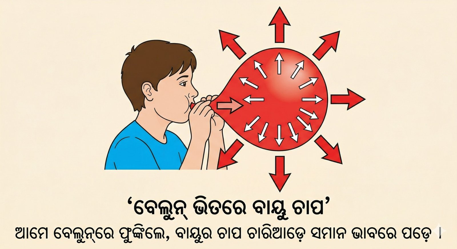 ଉଦାହରଣ: ଯେତେବେଳେ ତୁମେ ଏକ ବେଲୁନ୍ରେ ପବନ ଭର, ଭିତରର ବାୟୁ ବେଲୁନ୍ର କାନ୍ଥ ଉପରେ ଚାପ ପକାଏ, ଯେଉଁଥିପାଇଁ ବେଲୁନ୍ଟି ଫୁଲିଯାଏ।