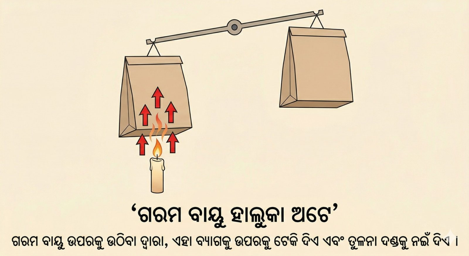 ଉଷ୍ମ ବାୟୁ (Hot air), ଥଣ୍ଡା ବାୟୁ (Cold air) ଠାରୁ ହାଲୁକା ହୋଇଥାଏ। ସେଥିପାଇଁ ଗରମ ପବନ ବା ଧୂଆଁ ସବୁବେଳେ ଉପରକୁ ଉଠେ।